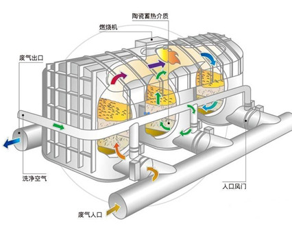 RTO主體結(jié)構(gòu)由燃燒室、陶瓷填料床和切換閥等組成。該裝置中的蓄熱式陶瓷填充床換熱器可使熱能得到回收,熱回收率大于95%,處理VOC時不用或使用很少的燃料。